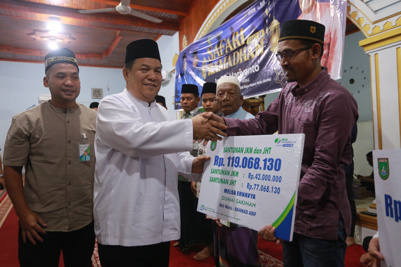 Plt Gubernur Riau SF Hariyanto menyerahkan bantuan saat safari Ramadan di Dumai (foto:Humas Pemprov Riau)